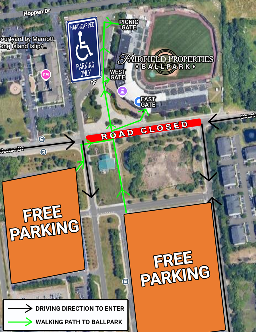 Parking at all Fairfield Properties Ballpark events is FREE! Fans may use the lots located outside the Suffolk County Court Houses (across the street from the ballpark). The administrative parking lot located directly outside of the stadium is for handicapped parking, front office employees and media only. All cars must have proper identification to park in the administrative lot.